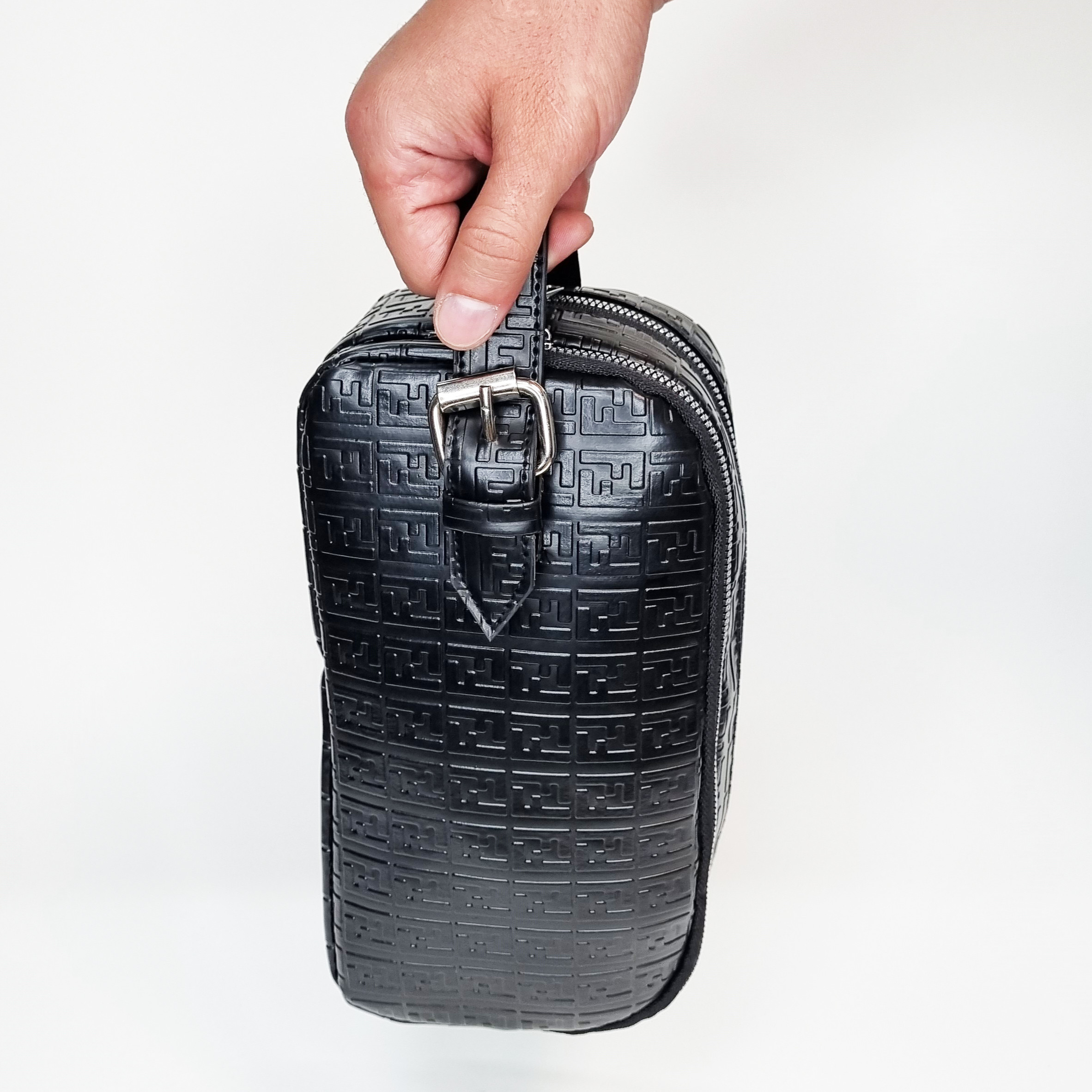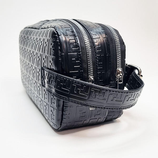 این کیف دستی شیک و لوکس با طراحی خاص و ظریف، انتخابی بی‌نظیر برای آقایانی است که به استایل و کیفیت اهمیت می‌دهند. بدنه کیف از چرم مصنوعی مشکی با کیفیت بالا ساخته شده که با نقش برجسته لوگوی Fendi (طرح دو F معکوس) پوشانده شده است و جلوه‌ای کاملاً لاکچری و مدرن دارد.